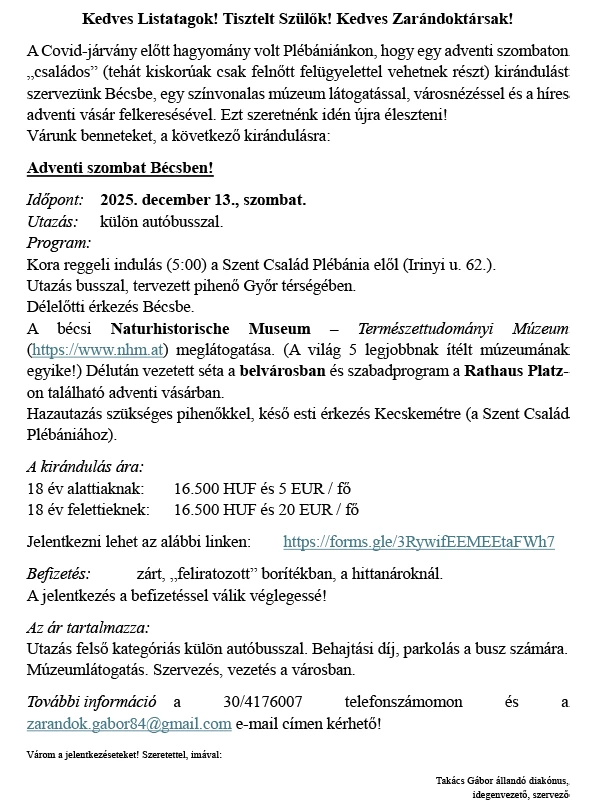 14. 2025. december 13-án, szombaton bécsi adventi kirándulás szerveződik, amelynek információs plakátját szintén kihelyeztük a hirdetőtáblára.