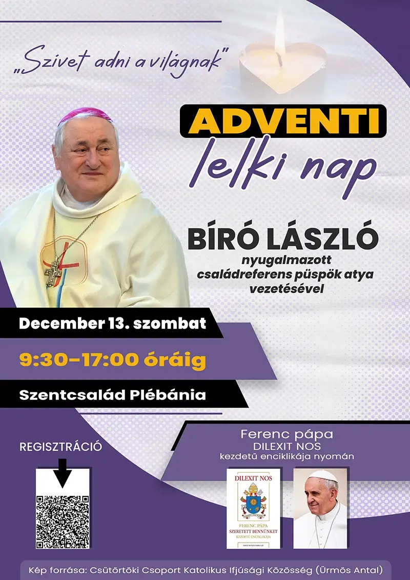 14. Szintén előre hirdetjük és szeretettel várunk Mindenkit 2025. december 13-án, szombaton délelőtt 10:00 és este 17:00 óra között adventi családos és egyházközségi lelki napra, melyet (boldogemlékű Ferenc pápaDilexit Nos kezdetű enciklikája nyomán) „Szívet adni a világnak” címmel Bíró László nyugalmazott családreferens püspök úr vezet. A lelki nap részletes programját kifüggesztettük a hirdetőtáblára. Kérjük, hogy regisztráljanak, akik részt szeretnének venni. Regisztrálni ide kattintva lehet.