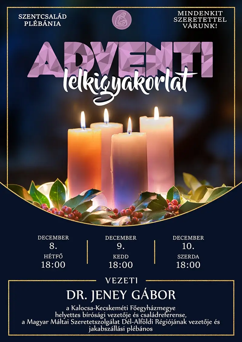 13. Előre hirdetjük, hogy Egyházközségünk adventi lelkigyakorlatát (természe tesen szentgyónási lehetőséggel egybekötve) főtisztelendő Dr. Jeney Gábor atya, Főegyházmegyénk családreferense és helyettes bírósági helynöke, jakabszállási plébános úr vezetésével tartjuk december 8-án hétfőn, december 9-én kedden és december 10-én szerdán az esti 18:00 órai Szentmisékben. Mindenkit szeretettel várunk.